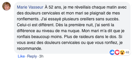 J'ai acheté cet oreiller après avoir vu une publicité Facebook. J'étais sceptique au début. J'avais des douleurs cervicales tous les matins depuis plusieurs années. Mon médecin me disait que c'était l'âge. La première semaine, je n'ai pas vu de grande différence, mais j'ai persisté. Au bout de 10 jours environ, j'ai commencé à me réveiller sans cette raideur dans le cou. Maintenant ça fait 1 mois et je n'ai presque plus mal. Mon seul regret c'est de ne pas l'avoir acheté avant.