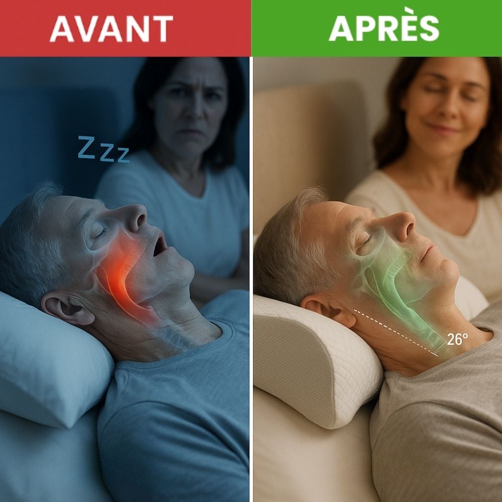 Lorsque votre tête tombe vers l'arrière pendant la nuit à cause d'un oreiller traditionnel, votre langue et les tissus de votre gorge sont tirés vers l'arrière, bloquant partiellement vos voies respiratoires. Cela provoque ronflements, apnée du sommeil et une mauvaise oxygénation de votre cerveau.